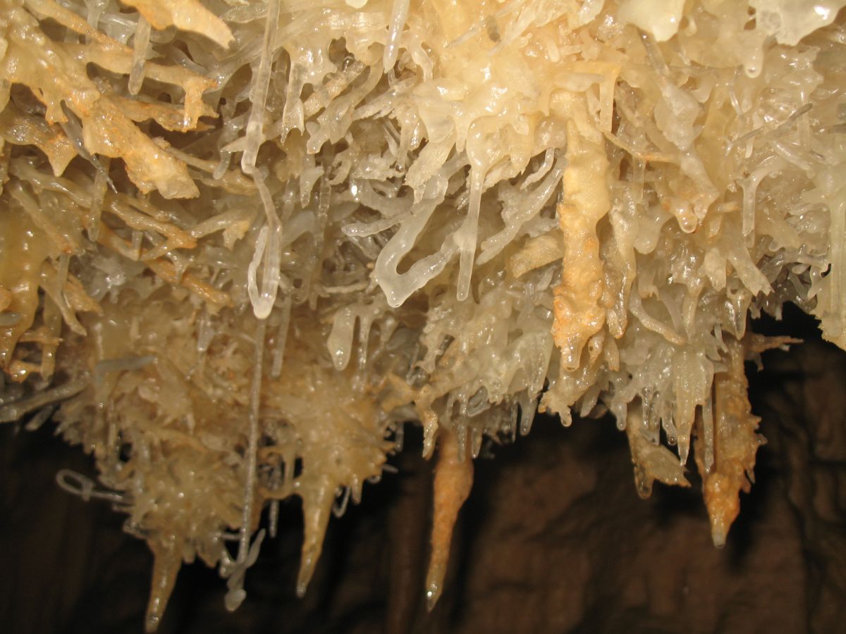 Wenn ein Tropfen lange Zeit hängt, entsteht ein Kalkring, der langsam länger wird. So entstehen die schönen, teilweise völlig klaren Sinterröhrchen, die wegen ihrer Form auch Maccaroni genannt werden